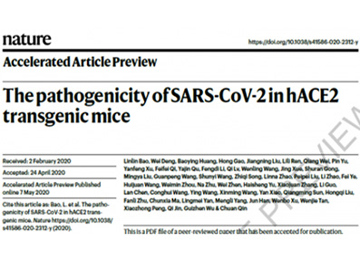 2020年5月7日,中国医学科学院医学实验动物研究所秦川团队联合来自于中国疾病预防控制中心病毒病预防控制所、中国医学科学院病原生物学研究所、中国医学科学院医学生物学研究所的团队,在Nature上正式发表了研究论文:“The Pathogenicity of SARS-CoV-2 in hACE2 Transgenic Mice”。 -