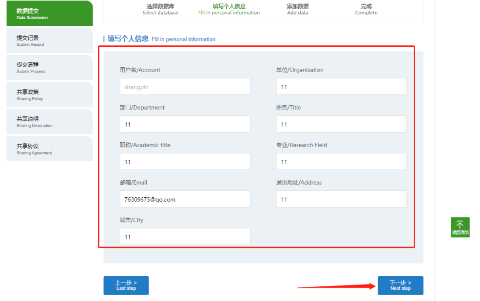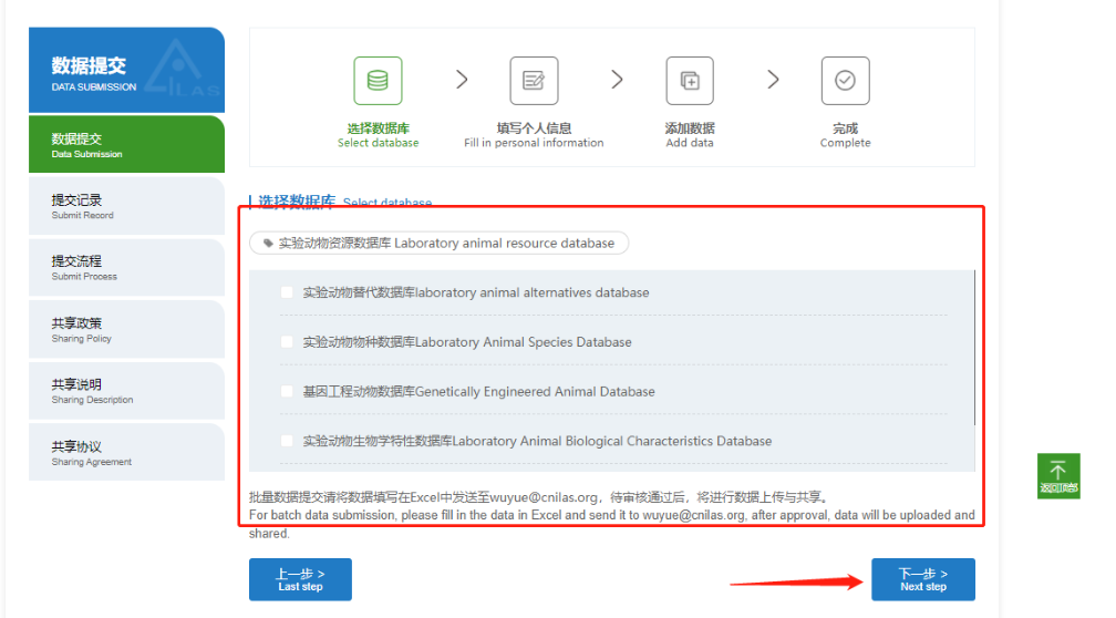 2.例如点击“实验动物资源数据库提交”,进入提交页面,选择其中一个数据库,点击下一步:如需批量数据提交,请点击下载对应数据库的数据模版,在模版表格里添加/编辑多条数据后,将表格发送至邮箱wuyue@cnilas.org,待网站管理员审核/完善通过后,网站管理员将对表格数据进行上传与共享。