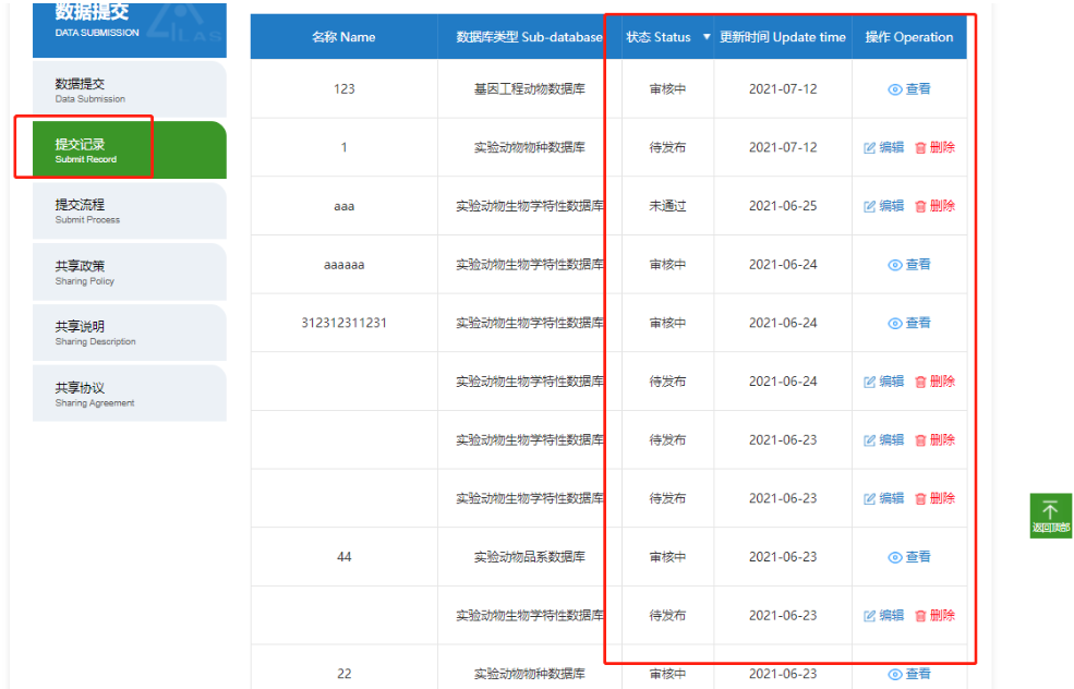 5.提交记录中,可看到每个数据的提交状态:待发布 审核中 已通过 未通过,可进行查看、编辑、删除。
