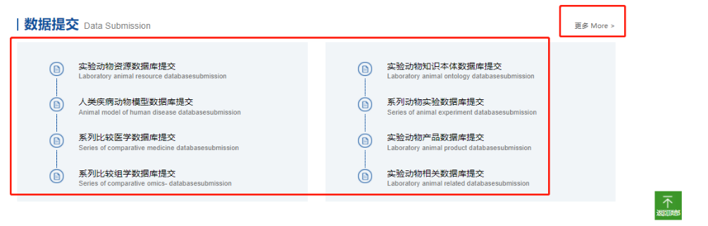 1.用户在前台登录后,找到首页“数据提交”位置,可以直接选择某一个数据库点击进入,也可点击“更多”选择。