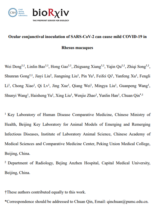 Ocular conjunctival inoculation of SARS-CoV-2 can cause mild COVID-19 in Rhesus macaques