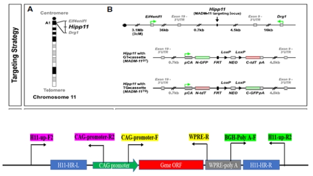构建CAG promoter 驱动的Hipp11位点定点插入的转基因载体,以CRISPE/Cas9的方式进行显微注射,设计三对引物对定点插入小鼠进行基因型鉴定,并完成测序,确保插入基因及插入位置正确。插入及检测信息如图1。