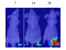 | 影像特征说明Image feature description | 分别在接种后的7、14、28d利用 小动物活体成像系统观察裸鼠爪垫接种肿瘤的生长情况。在接种的第7天就可以观察到肿瘤荧光,通过肿瘤组织发出的荧光的光子数确定肿瘤的大小,随着观察天数的增加,肿瘤的体积和发光强度增加。 |