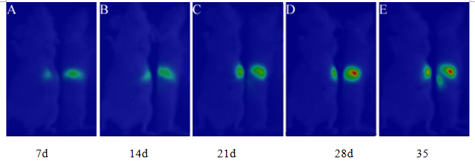 影像特征说明Image feature description 胃原位接种MGC803-Luc+肿瘤生长影像分析(图为小鼠仰卧,小鼠右侧放一个三棱镜