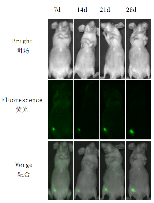 | 影像特征说明Image feature description | 在接种的7、14、21、28天观察肿瘤的生长情况。在接种的第7天就可以观察到肿瘤荧光,通过肿瘤组织发出的荧光的光子数确定肿瘤的大小,随着观察天数的增加,肿瘤的体积和发光强度增加,且具有很好的相关性。 |