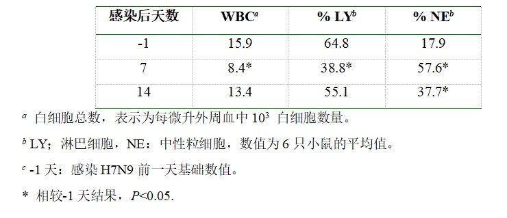 ![]() 与感染前相比,感染后第7天,雪貂模型出现显著降低的白细胞总数和淋巴细胞数,以及显著升高的中性粒细胞数。 |
